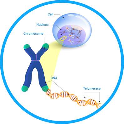 The shortening of telomeres can be reversed by the enzyme telomerase. Telomerase restores telomeres, the end caps of chromosomes that protect our DNA, protect cell functionality, and extend cell life.
