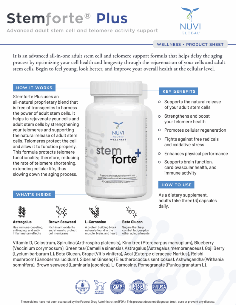 Formulated with powerful natural ingredients, Stemforte Plus® is a revolutionary stem cell and telomere activity support formula that helps delay the aging process by optimizing your cell health and longevity through the rejuvenation of your cells and strengthening of your telomeres.